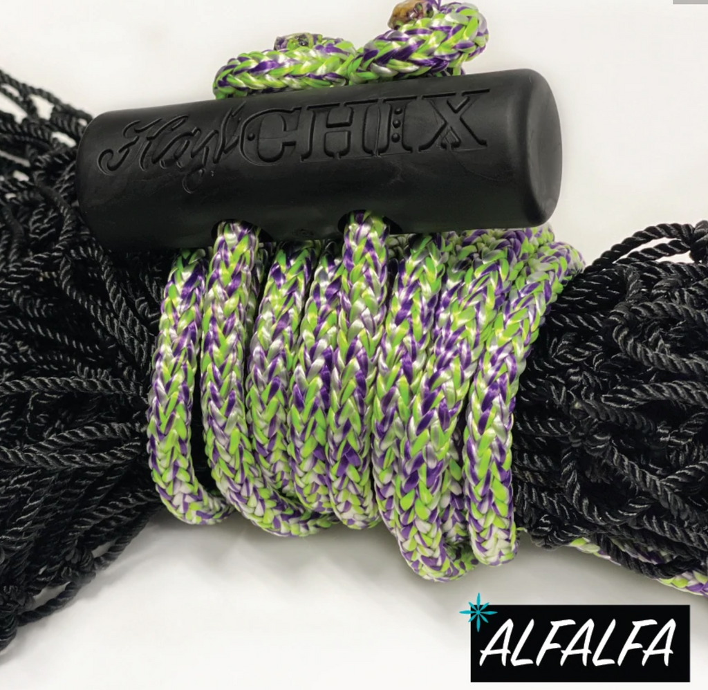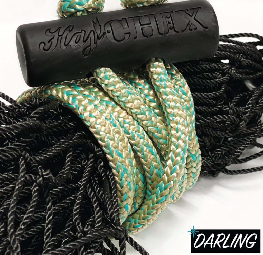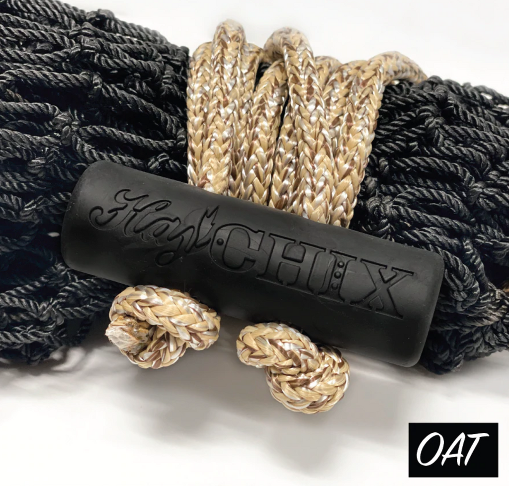 The Hay Chix® Half Bale Net (formerly known as 'Mini Net') attaches easily to a trailer, eye hook, fence or tree, it's perfect for keeping your feeding program on track while on the go. This net holds about 1/2 of a small square bale (4-6 flakes.)